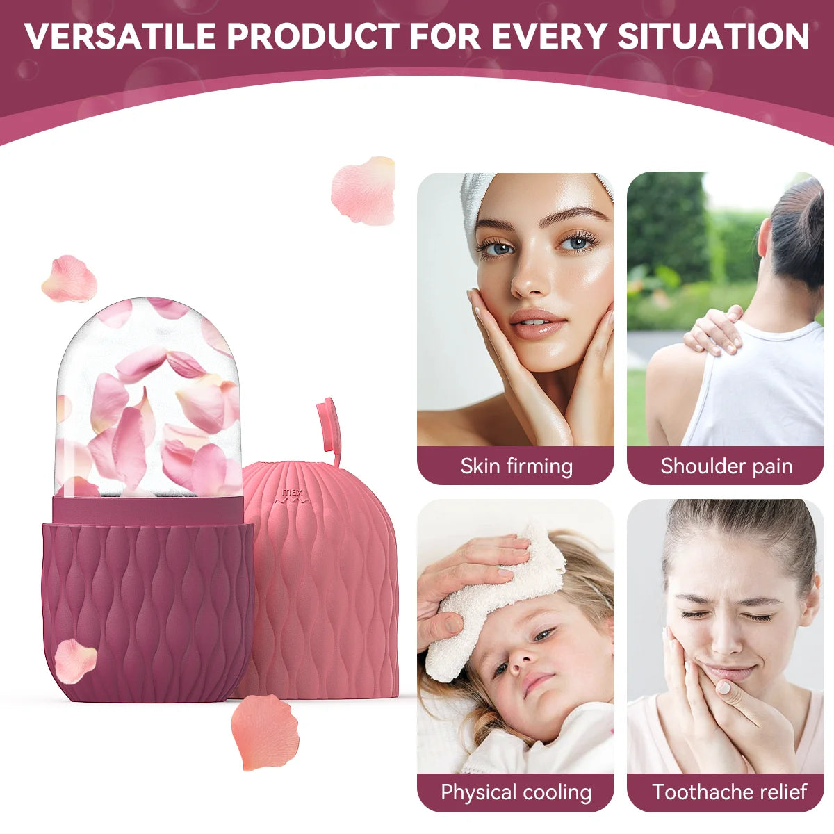The ChillGlow Silicone Ice Roller provides instant cooling and relief for tired, puffy, or irritated skin. Its gentle rolling action helps reduce redness, calm inflammation, and refresh the face after a long day or exposure to heat.